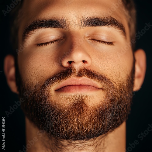 © Nunthaphuk, Obraz premium Calm man meditating with closed eyes and beard.