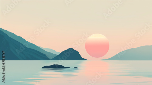 © Cozy Art, Naklejka premium Calm minimalist sunset landscape with mountains, lake and island silhouette