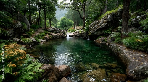 © Ramesh, Fototapeta premium Calm nature pool surrounded by green high resolution picture