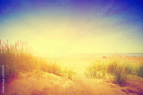 © Photocreo Bednarek, Obraz premium Calm ocean and sunny beach with dunes and green grass. Vintage
