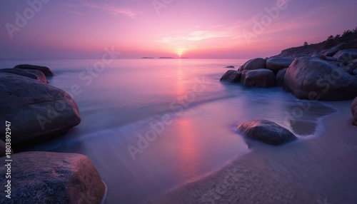 © miss irine, Obraz premium Calm ocean at dawn washes over smooth rocks on a sandy beach. The pink and purple sky reflects on the water surface. Serene natural landscape scene.