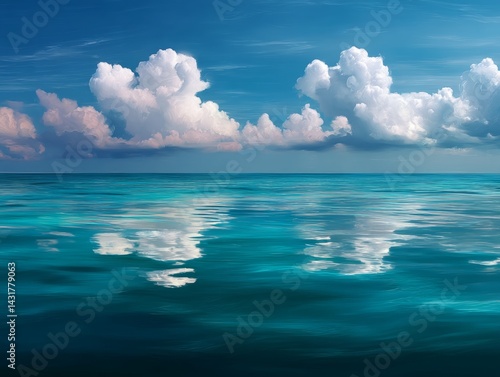 Obraz premium Calm ocean reflecting beautiful cumulus clouds in a sunny day
