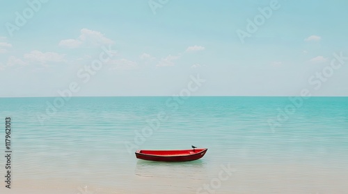 Naklejka premium Calm ocean scene, red boat, tranquil day, scenic view, peaceful background,...