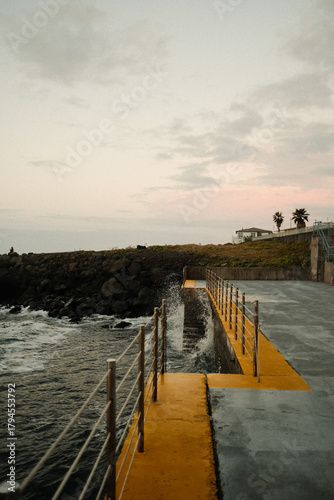 Fototapeta premium Calm ocean scene with ancient railing and mellow clouds
