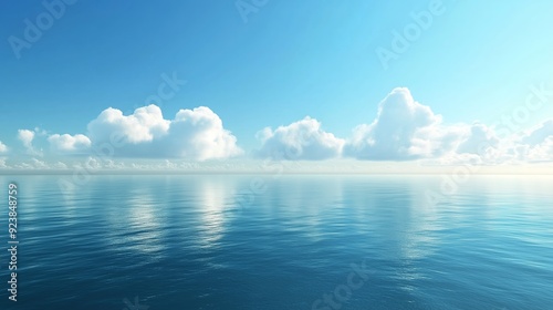 Obraz premium Calm ocean surface reflecting fluffy clouds under a bright blue sky