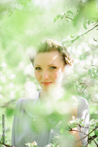 © wolfhound911, Fototapeta premium Calm portrait of a beautiful woman in apple blossom. Boho girl sensual portrait in modern floral dress in greenery. Place for text