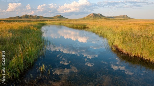 © tugkiara, Fototapeta premium Calm Prairie Creek Reflecting Clouds