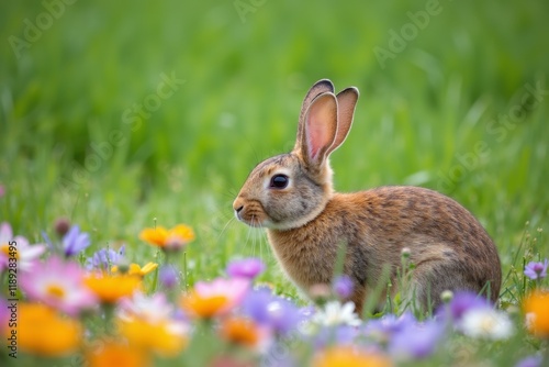 © Dan, Fototapeta premium Calm Rabbit Amidst a Field of Flowers