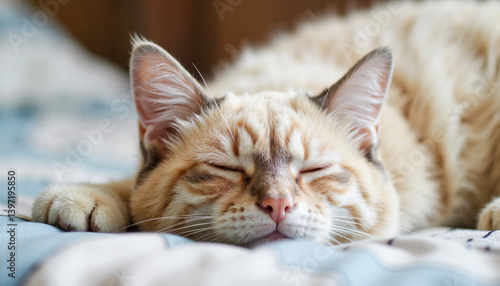 © Alex_Kalin, Obraz premium Calm resting cat sleeping peacefully on soft bedding, serene comfort