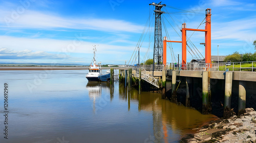 Fototapeta premium Calm river, fishing boat at dock, sunny day, industrial background, perfect for travel/tourism brochures