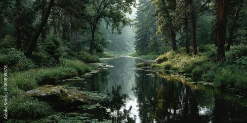 © Michael, Obraz premium Calm river flowing through a tranquil forest landscape at dawn with mist rising and greenery reflecting in the water