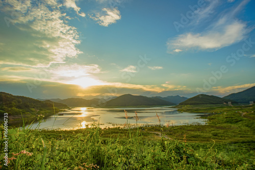 © Songsak C, Fototapeta premium Calm River, Mountains, and clouds.