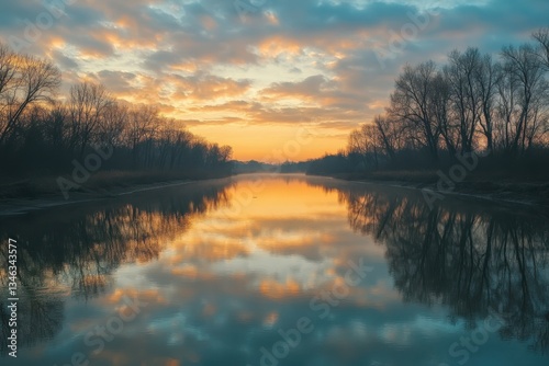 © sanaan, Obraz premium Calm river reflecting a stunning sunset with dramatic clouds and serene trees along the banks