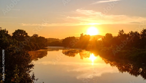 © Resa, Obraz premium Calm river reflecting a vibrant sunrise, mist hangs low over the water
