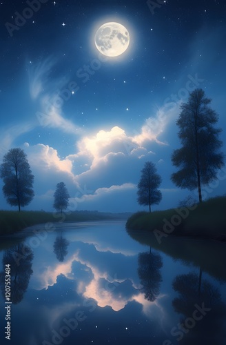 © Koto, Fototapeta premium Calm River Under Midnight Moonlight and Starry Sky Phone Background