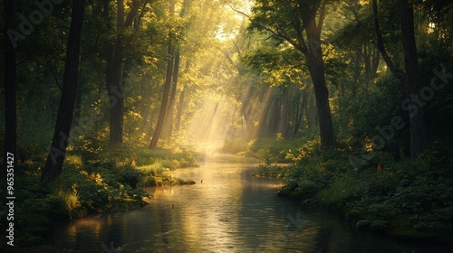 Obraz premium Calm river winding through a dense forest,