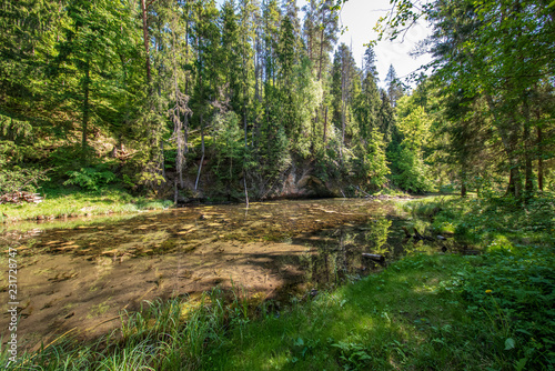 © Martins Vanags, Obraz premium calm river with reflections of trees in water in bright green foliage in summer