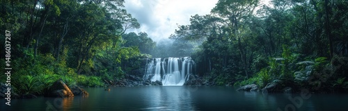 © letter, Fototapeta premium Calm river with smooth flowing waterfall surrounded by dense green forest under a cloudy sky creating a serene and peaceful atmosphere