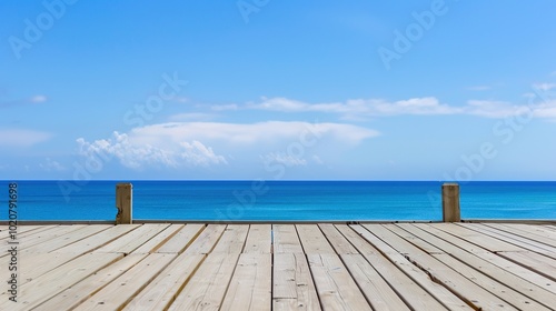 Fototapeta premium Calm sea horizon view from a weathered wooden platform, evoking tranquility