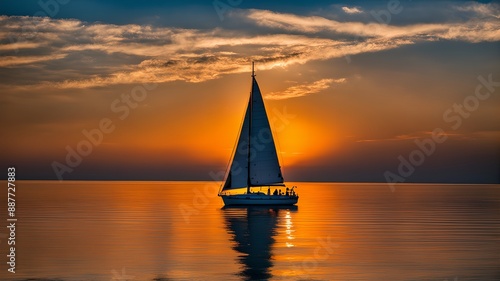 © GyeongHyeon, Fototapeta premium Calm sea, Sailboat sailing far away, Generative AI