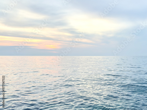 Fototapeta premium Calm sea under a sunset sky. waterline. sea water surface. mockup. product...