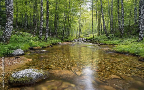Obraz premium Calm stream flowing through lush green forest.