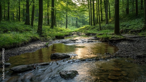 © BrandwayArt, Obraz premium Calm stream flows through lush forest during golden hour
