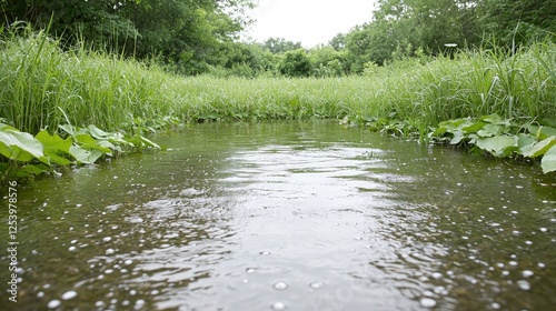 Fototapeta premium Calm stream flows through lush green meadow. Use Nature background