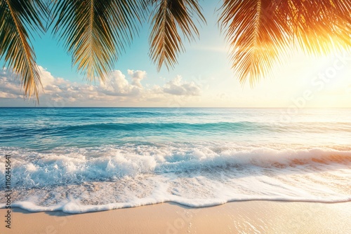 © Sarinya, Fototapeta premium Calm Sunset Over Tropical Beach with Waves and Palm Leaves in Clear Sky