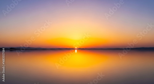 © SAR, Naklejka premium Calm, tranquil sunset over a still lake, reflecting the fiery colors of the sky.