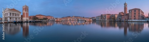 Fototapeta premium Calm Venetian canal dawn, bridge reflection, historic buildings. Travel postcard