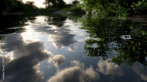 © BrandwayArt, Fototapeta premium Calm water reflects clouds and tree branches in serene nature