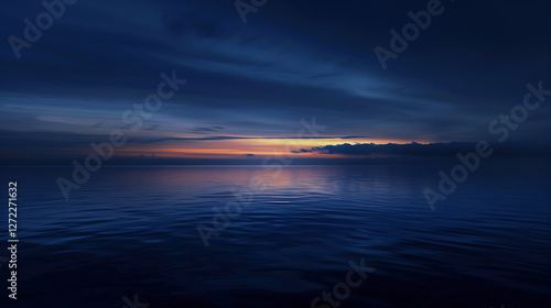 Naklejka premium Calm waters reflect the deep blue hues of dusk over the horizon in this...