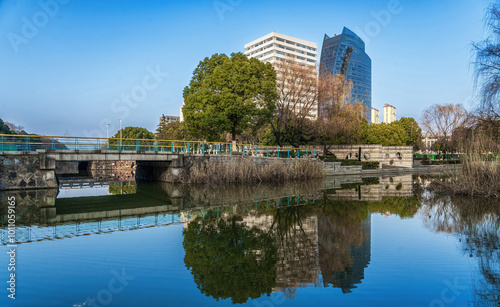© evening_tao, Obraz premium Calm Waterscape with Urban Backdrop