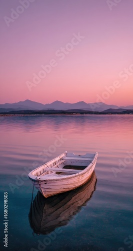 © Ahmad, Naklejka premium Calm white boat on still lake, pink sunrise