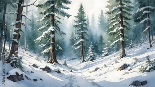 Naklejka premium Calm winter forest scene with snow-laden trees and a tranquil path through...