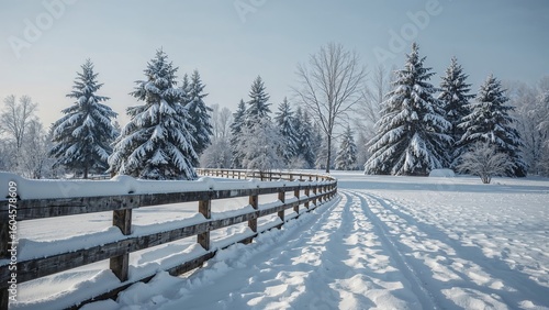 Naklejka premium Calm winter vista showing snow-heavy trees alongside a weathered fence...