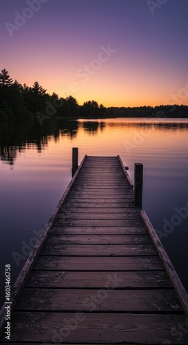 Naklejka premium Calm wooden dock on serene lake at sunrise
