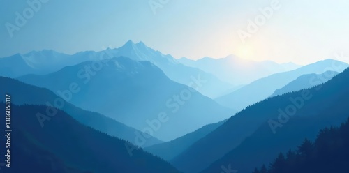 © Jame, Obraz premium Calming abstract blue and white gradient background with a cool spotlight on a misty mountain range, calm, mist, nature