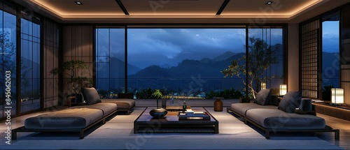 Fototapeta premium Calming Essence of a Japanese Zen-Style Living Room Under the Soft Glow of Evening