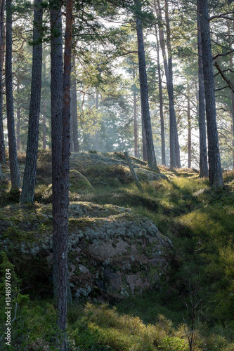 © Jonas, Obraz premium Calming forest with tree trunk and mist