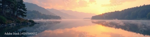 Fototapeta premium Calming lake scene at dawn with mist rising from water, landscape, peaceful