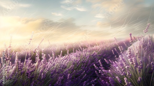 © vanilnilnilla, Naklejka premium Calming Lavender Meadow with Drifting Clouds in Golden Hour Scenery