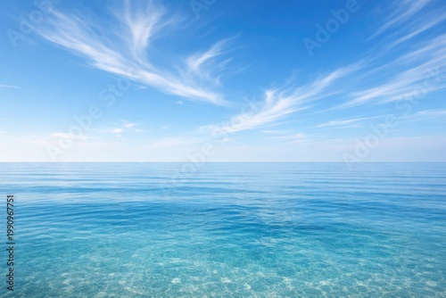 Fototapeta premium Calming seascape with serene blue sky and light cloud wisps above clear ocean...