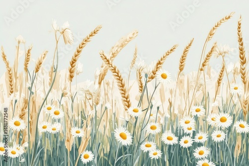Obraz premium calmness, chamomile fields and golden wheat heads, soft movement, seamless...