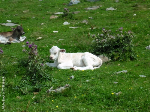 © Alexandre Cuesta, Obraz premium Calves resting in green field on sunny day