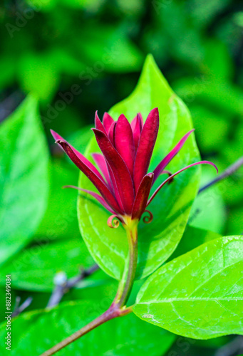 Fototapeta premium Calycanthus floridus - red flower on a background of green leaves