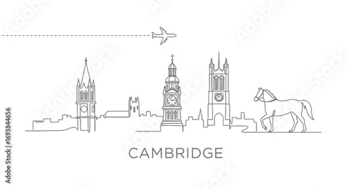 © godsfavoritearts, Fototapeta premium Cambridge UK Skyline Illustration with Airplane with Horse.