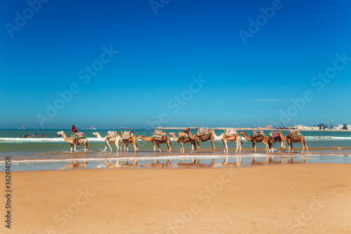 Obraz premium Camel caravan goes along the shore of the Atlantic Ocean.