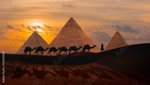© muratart, Fototapeta premium Camel caravan in front of the Great pyramid of Giza complex at amazing sunset - Cairo, Egypt